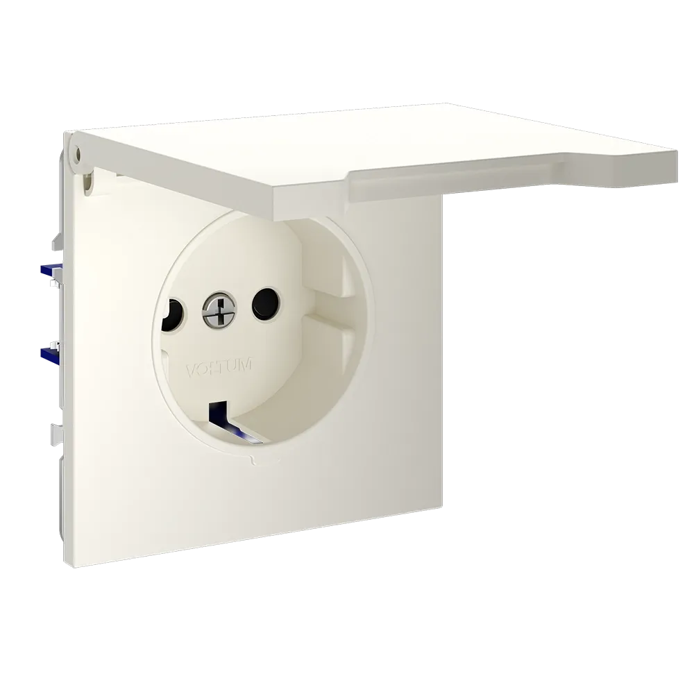 Благодаря степени защиты IP40 и наличию крышки, розетка надёжно защищена от проникновения твёрдых частиц и брызг воды, а встроенные шторки предотвращают доступ детей к контактам. Это делает изделие одним из самых безопасных в линейке Voltum.